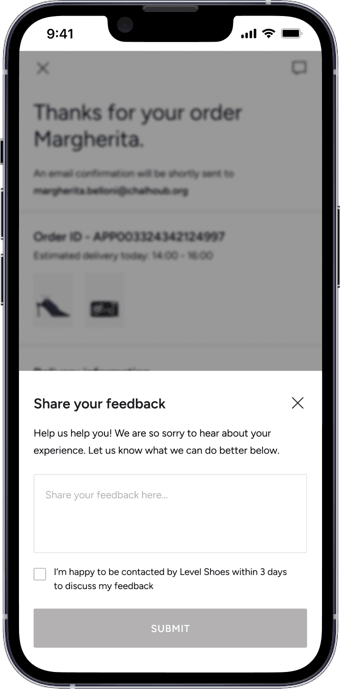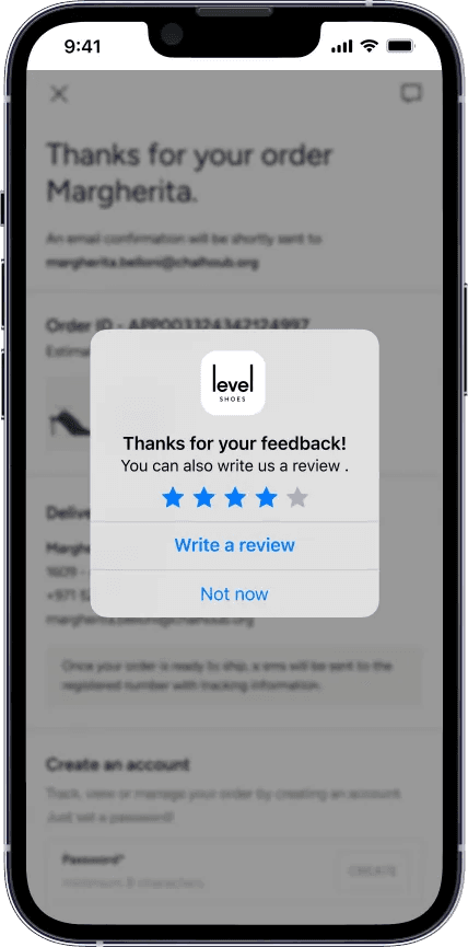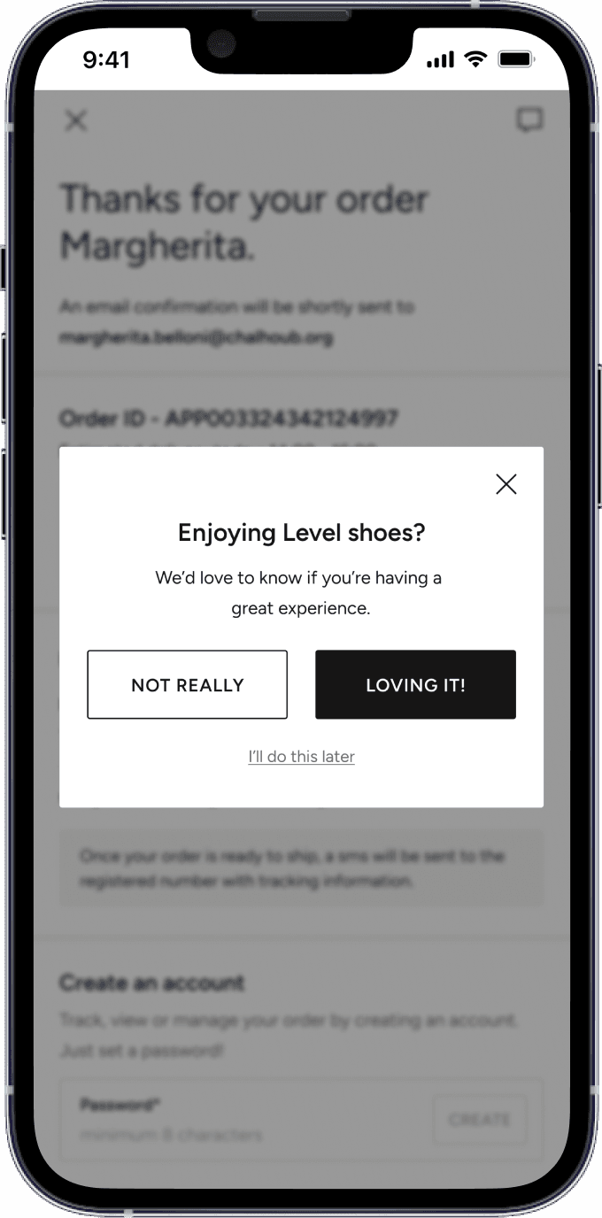We decided to create a pop-up to prompt the customers to leave feedback for Level Shoes with 2 steps. In the first step, we asked them how was their experience was like which we called a soft pop-up’. If the customer had a positive experience, then in the second pop-up, we are asking them if they want to leave feedback in the app store.